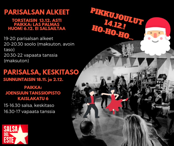Tämän viikon jälkeen torstain salsoja on enää 13.12. ja keskitason tunteja 2.12. Itsenäisyyspäivänä 6.12. jätämme tanssit väliin. Kaikki mukaan viimeisille kerroille sekä pikkujouluihin 14.12.!