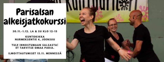 Parisalsan alkeisjatkokurssilla harjoittelemme lisää salsan peruskuvioita sekä vartalon käyttöä, kuubalaista rytmiä ja tunnelmaa, sujuvaa tanssia ja haemme rohkeutta osallistua salsailtoihin Joensuussa sekä muualla maailmassa. Harjoituksia tehdään yksin sekä parin kanssa, mutta et tarvitse omaa paria mukaan kurssille. Vaihdamme pareja jatkuvasti kurssin aikana, joten kaikki pääsevät tanssimaan kaikkien kanssa!