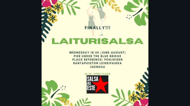 Olit sitten uusi tai konkari tanssija, tule nauttimaan kesäillan lämmöstä joka keskiviikko Suvantosillan kupeeseen laiturille. Musiikki soi joka kesäkeskiviikko elokuun loppuun saakka klo 18-20 (HUOM! säävaraus). Paikalle löydät etsimällä Pohjoisen rantapuiston leikkipaikan kartasta ja kuuntelemalla latinorytmien sointia!